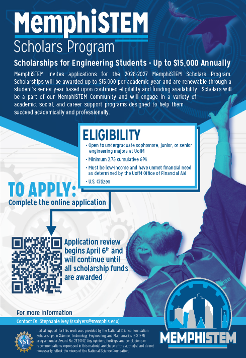 We are excited to announce a new scholarship program, funded by the National Science Foundation, that is open to our undergraduate engineering majors who are rising sophomores, juniors, or seniors in Fall 2026. Review of applications for the 2026-27 academic year begins April 6, 2026.